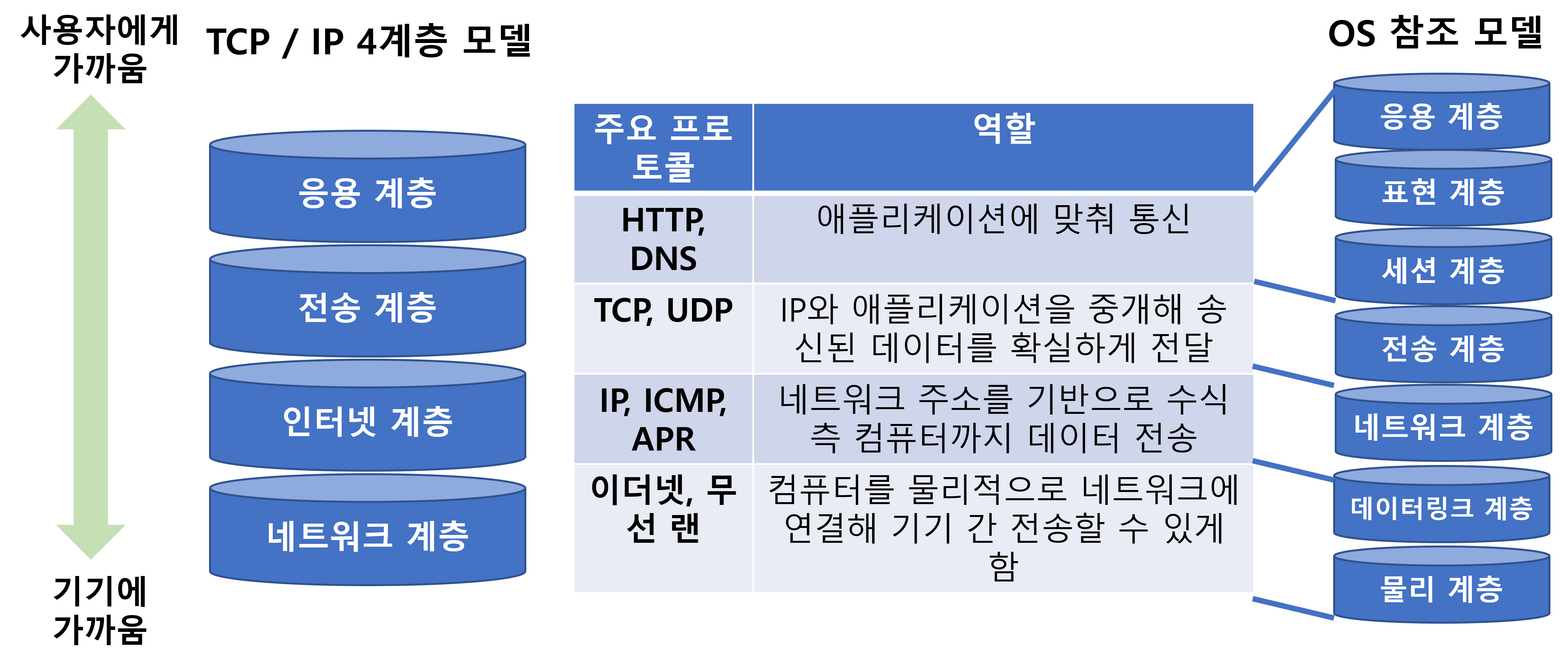 - OS 참조 모델: 컴퓨터가 가져야 하는 통신 기능을 계층 구조로 나눈 모델이나 벤더 간에 상호 통신할 수 있는 네트워크 모델