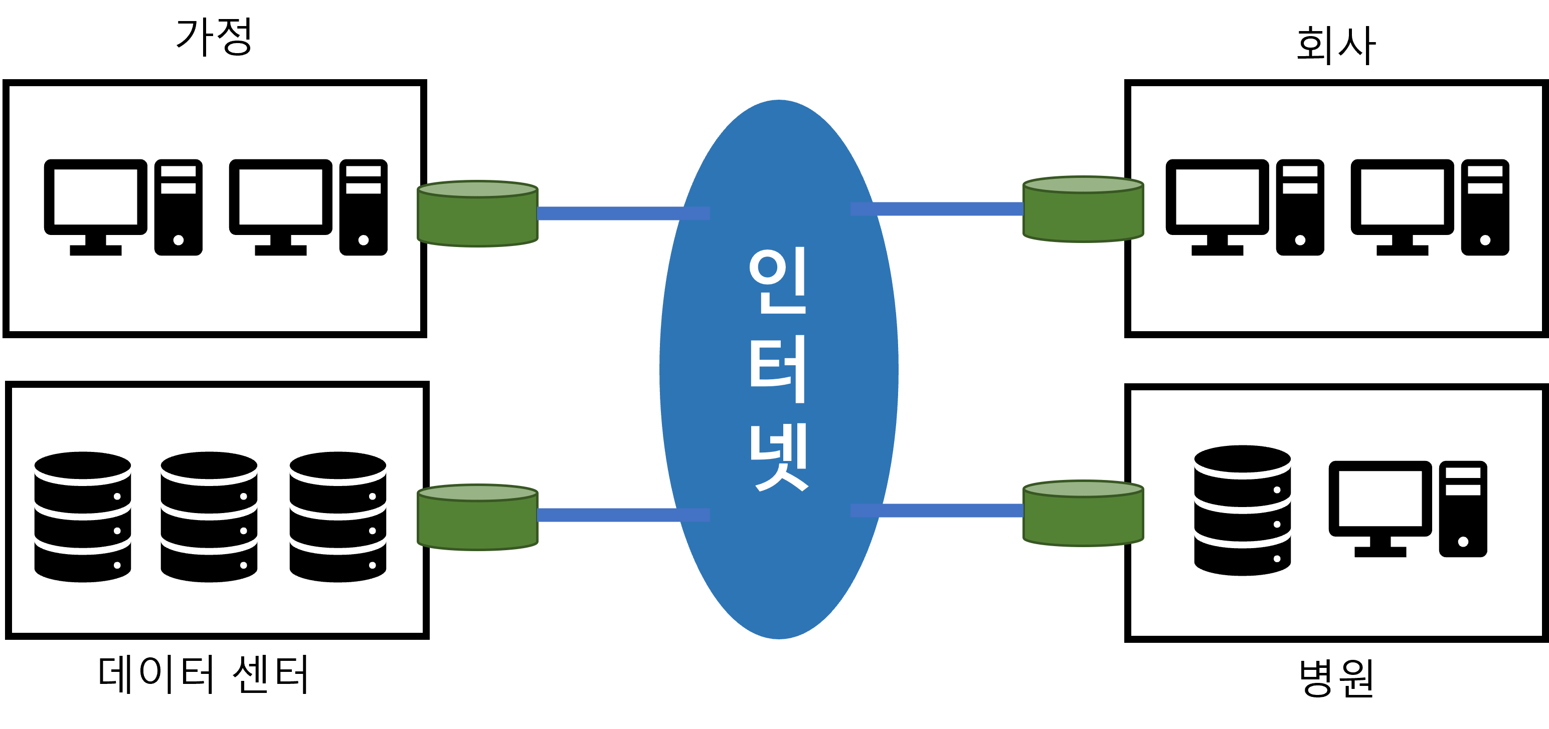 - 왠 WAN: 거점과 거점, 또는 거점과 인터넷을 연결 (회사와 인터넷, 회사와 회사)