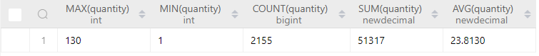 quantity의 최댓값, 최솟값, 개수, 총합, 평균값을 구하시오.